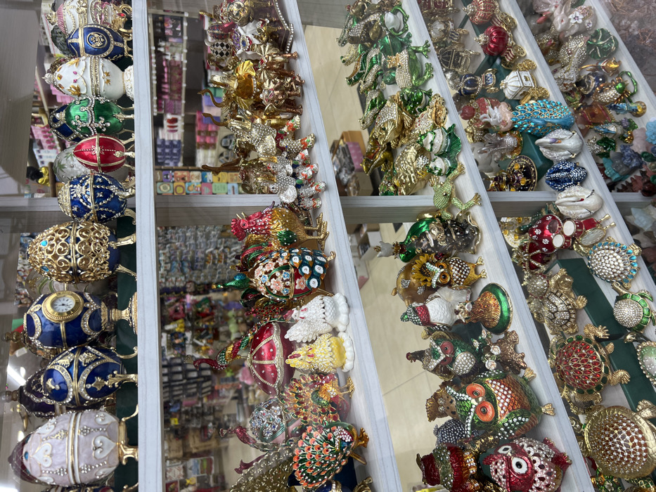 This image presents a detailed view inside a retail establishment, likely a souvenir or gift shop, located in Bansko, Bulgaria. The scene focuses on four white display shelves filled with numerous elaborate, decorative trinket boxes and figurines. The top shelf features a collection of large, ornate egg-shaped boxes, reminiscent of Fabergé eggs, standing on small pedestals. These items are made of metal, extensively decorated with enamel in colors such as gold, blue, white, red, and green, and embellished with small crystals; one prominent blue egg incorporates a small clock. The second shelf displays an array of animal-themed trinket boxes and figurines, primarily birds. Visible subjects include several peacocks, roosters, and hens, crafted with colorful enamel and crystal details. The third shelf showcases a variety of owl figurines in different sizes and colors (including red, green, and gold), alongside numerous green and gold frog figures. All items on this shelf are intricately decorated with crystals. The partially visible fourth shelf contains an assortment of turtle-shaped boxes, white and blue swan figures, and other small, ornate decorative pieces, some resembling miniature drums or carriages. Below this, a lower shelf holds various natural stones or crystals. All objects are static, arranged for retail display. The background is blurred, showing additional merchandise typical of a souvenir shop. No individuals are present in the immediate foreground.
