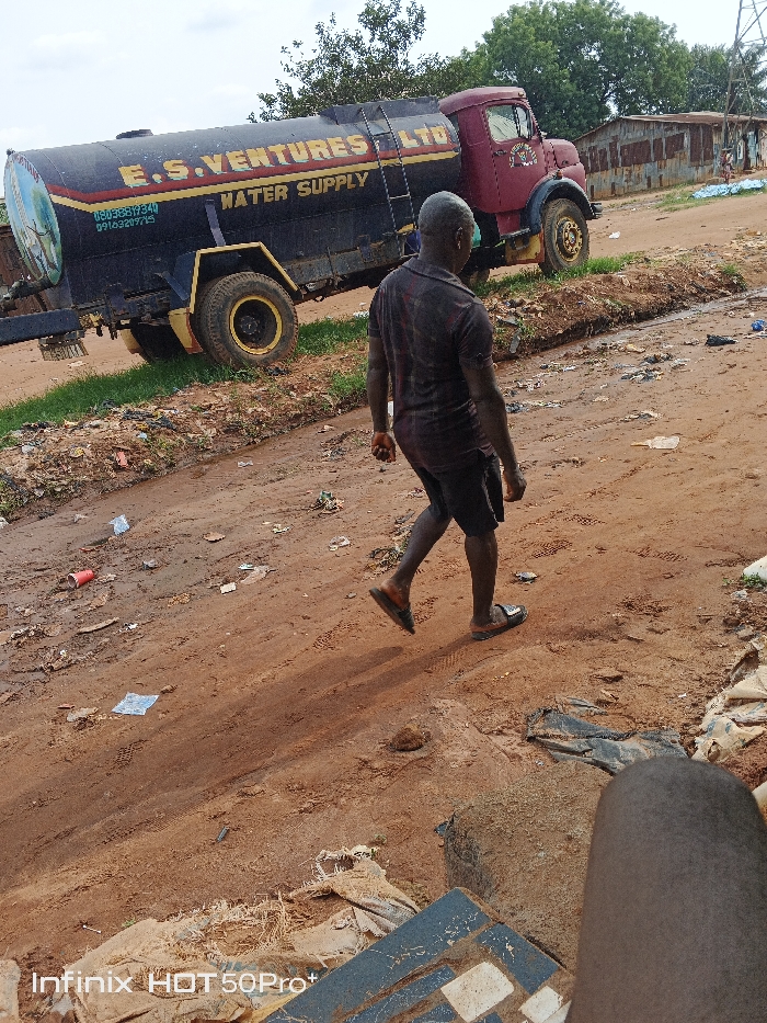 A man walks on a reddish-brown dirt road strewn with trash. He wears a dark t-shirt, black shorts, and sandals. Behind him is a dark water tank truck with “E.S. VENTURES LTD WATER SUPPLY” painted on the side. A rusty building stands in the background beneath green trees and a cloudy sky. The ground is uneven and muddy. The bottom of the frame shows part of a mosaic-tiled surface with the watermark of “Infinix HOT 50Pro+”.
