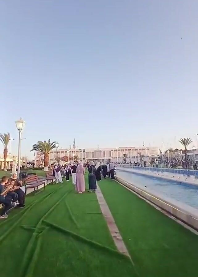 wide outdoor area, possibly a park or public space, with people walking around. There is a long, narrow pool with fountains spraying water. The ground is covered with artificial green turf. Benches are located on the side where people are sitting. Palm trees are present. People, mostly women wearing headscarves, are walking along the path beside the pool. The sky is clear and blue. In the background, there is a large building with architectural details and windows.