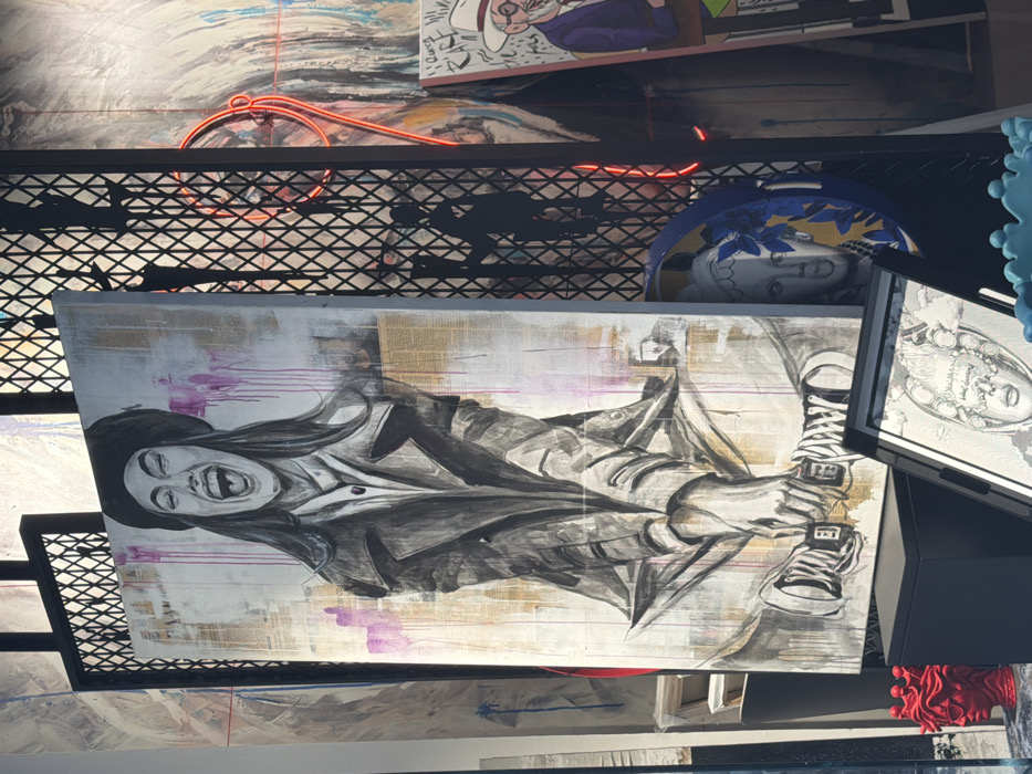 The image depicts an indoor scene within an art gallery or studio located in Bnei Brak, Israel. The central focus is a large, vertically oriented canvas painting featuring a woman rendered predominantly in black and white with subtle color accents. The woman is depicted from the mid-thigh up, wearing a dark beret, a collared shirt, and an open trench coat. She is captured in an expressive state, laughing heartily with her mouth open and eyes closed or squinting. Her hands are clasped near her lower torso, seemingly holding or adjusting the laces of two dark sneakers visible at the bottom of the canvas. The background of the painting incorporates text elements resembling newspaper print and drips of fuchsia paint. To the immediate right of this central painting, a black metal grate with a diamond pattern is visible, behind which a vertical red neon light glows. Further right, a portion of another painting, depicting a man in a hat and glasses with vibrant colors, can be seen. To the left of the main painting, an additional canvas with abstract markings is partially visible. In the foreground, a black rectangular pedestal supports a framed artwork of a woman's face with intricate headwear. To the bottom left, a red, textured, sculptural object is present. The lower right foreground includes a partially visible blue spherical object with white and yellow designs and a light blue, crown-like decorative item. The overall environment suggests an exhibition or workspace for contemporary art.