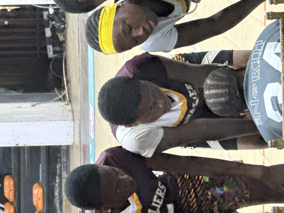 The scene depicts a group of four individuals engaged in a huddle on an indoor sports court in Iganmu, Nigeria. Three individuals, appearing to be young adults or teenagers with dark complexions, are standing and leaning forward, looking down. The individual on the far left wears a maroon and white/gold jersey, where "LIERS" is visible, and patterned shorts. This person has short, dark hair and a single earring in the left ear. The central standing individual wears a maroon and white/gold jersey, possibly with "CAVALIER" visible, and dark shorts, also possessing short, dark hair. The individual on the right wears a white and gold/maroon jersey, a bright yellow headband, and a white beaded necklace. This person also has short, dark hair under the headband and a single earring in the right ear. All three standing individuals are intently focused downwards, suggesting they are listening or observing something at a lower level. Below them, partially visible in the foreground, is the back of a fourth individual, seated in what appears to be a chair with an ornate, golden-toned backrest. This seated person wears a grey t-shirt with "NORTH VOLLEYBALL" and the number "24" printed on the back. The scalp of the seated individual features closely cropped cornrow-style braids. The environment is an indoor sports facility with a light-colored court floor marked with a distinct light blue line. In the blurred background, orange stadium-style seating is visible on the upper left, while a white structural pillar and some cables or wires are present on the right, indicating a functional rather than decorative background.