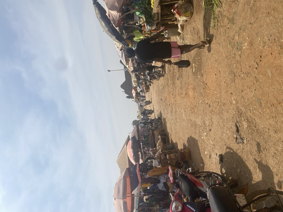 The image displays an unpaved outdoor market pathway in Kafanchan A, Nigeria, under a bright, partly cloudy sky