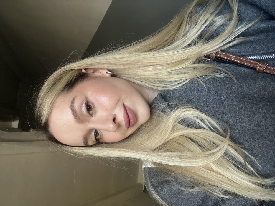 A young adult female is depicted in a close-up, chest-up self-portrait, likely taken indoors. She possesses light skin, light brown eyes, and long, straight blonde hair with visible darker roots that falls over her shoulders and partially covers her chest. Her expression features a slight, closed-mouth smile. Visible makeup includes light eyeshadow, mascara, blush, and a muted pink lipstick. A single silver-colored hoop earring is present in her visible right ear. She is wearing a dark grey, textured, hooded garment, possibly a sweatshirt or sweater. A brown strap with visible stitching, consistent with a shoulder bag, is visible over her right shoulder. The background consists of an indistinct interior space, divided horizontally into an upper section of a lighter, off-white or light beige color, and a lower section of a darker, muted grey hue. The lighting is soft and ambient, suggesting an indoor setting such as a corridor or stairwell. No specific architectural details or unique features are present to determine a precise location within the city of Minsk, Belarus.
