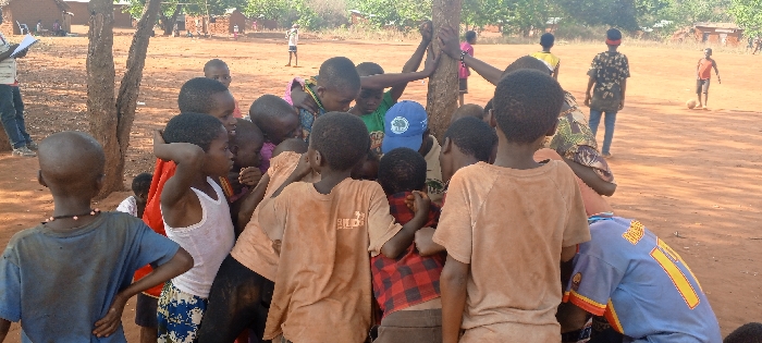 The image captures an outdoor scene in Ngalula, Democratic Republic of the Congo, under bright daylight. A central cluster of approximately 15-20 children, varying in age, are tightly gathered around a slender tree trunk, with many individuals touching the tree or each other. Their clothing includes diverse casual wear such as a blue t-shirt with a beaded necklace, a white tank top, a red and black plaid shirt, and a blue t-shirt with the number "11." One child wears a blue baseball cap. The ground is a uniform reddish-brown dirt. In the background to the left, a partially visible adult stands, holding papers or a clipboard. To the right in the background, an unpaved field extends, where several other children are present; one boy in an orange shirt stands near a white soccer ball, while another boy wears a patterned shirt and appears to have a red blindfold over his eyes. Distant small, single-story structures with light walls and dark roofs are visible among sparse green foliage in the far background.