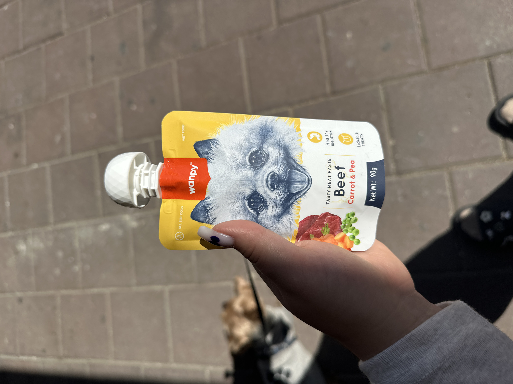 The image displays a forensic scene captured outdoors in Ramat Gan, Israel, on a sunny day. The foreground is dominated by a human left hand, fair-skinned, holding a "Wanpy" brand pet food pouch. The thumb features a long, pointed, white acrylic nail adorned with a dark blue heart design. The flexible pouch, primarily yellow with a red top section, has a white, ridged screw-cap. Its label indicates "TASTY MEAT PASTE," "Beef Carrot & Pea," "Net Wt: 90g," and "WET FOOD," suitable for "ALL SIZE DOGS," promoting "Healthy digestion" and described as "Lickable TREATS." An illustration of a fluffy, light-colored dog is prominent on the pouch, alongside images of beef, carrots, and peas. In the blurred background, a small, light-brown dog is visible, possibly resting or on a leash, partially obscured by shadows. The ground consists of reddish-brown rectangular paving stones, typical of a city sidewalk or pedestrian area. The lower legs and feet of a person, likely the individual holding the pouch, are visible at the bottom of the frame, wearing dark pants and dark patterned shoes.