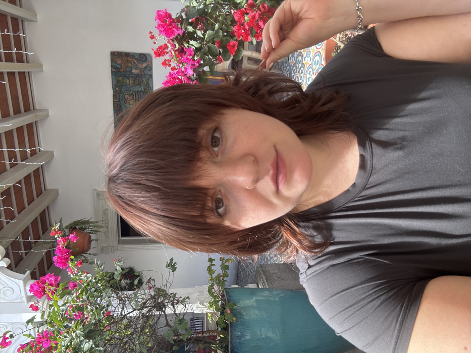 A woman with brown, fringed hair is centered, wearing a black T-shirt. She's indoors, with an outdoor courtyard visible behind her. Red and pink bougainvillea flowers are prominently displayed, along with a tile mural on the wall. A pergola with string lights extends along the building facade. A window is partially visible in the background. The woman is looking directly at the camera, and part of her arm and bracelet is visible at the top-right corner.