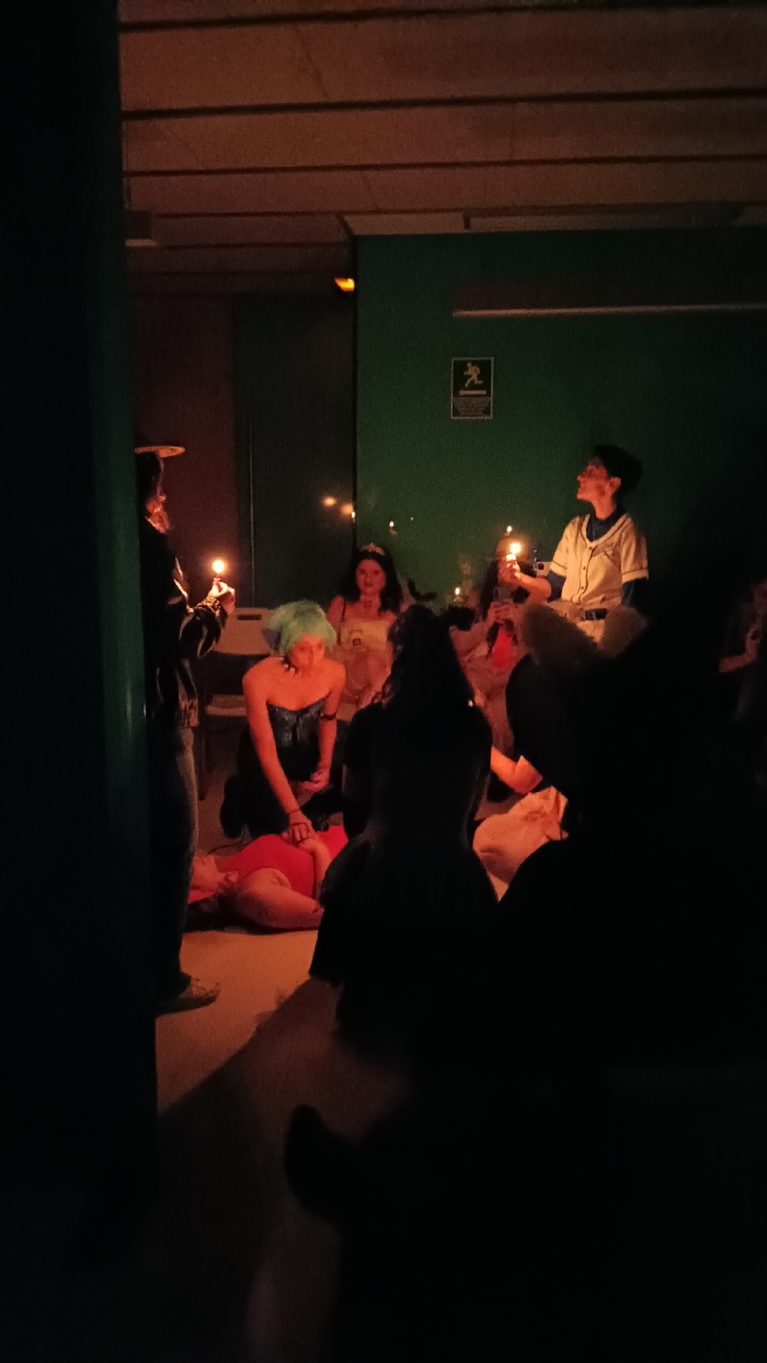 The image depicts a dimly lit indoor gathering of approximately ten individuals, illuminated primarily by handheld candles, within a room in the city of Valencia, Spain. The background features a dark green wall, upon which a white emergency exit sign with a black 'running man' symbol is mounted on the right. The ceiling above displays exposed horizontal beams with a reddish-brown hue. In the center-left, a person with distinct teal-colored hair, wearing a dark blue strapless top, kneels over another individual lying supine on the light-colored floor, dressed in a red top. The kneeling person's hands are positioned on the chest of the recumbent individual. To the far left, a standing person wearing a wide-brimmed hat and dark clothing holds a lit candle at waist height. Behind the central kneeling figure, a person adorned with a tiara and light-colored attire is seated, also holding a candle. Further right, a person in a light-colored shirt and glasses is visible, holding a candle and looking upwards. Several other participants are present, mostly as darkened silhouettes, some also holding candles. The precise nature of the event, while involving costumed participants and focused interaction, is not discernible from the visual evidence, nor is the specific building or area within Valencia.