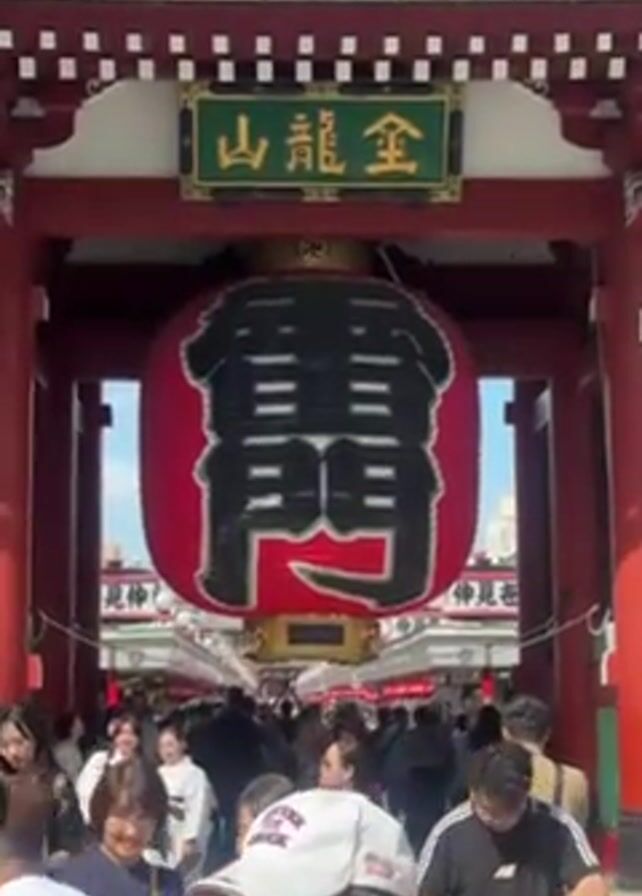 crowded gate in Japan. The gate is red with a large red lantern hanging in the center with large black Japanese writing on it. There is also a sign on the gate with Japanese characters. People are walking through the gate in both directions, and the gate is surrounded by buildings with tiled roofs. It is daytime, and the sky is visible through the gate.