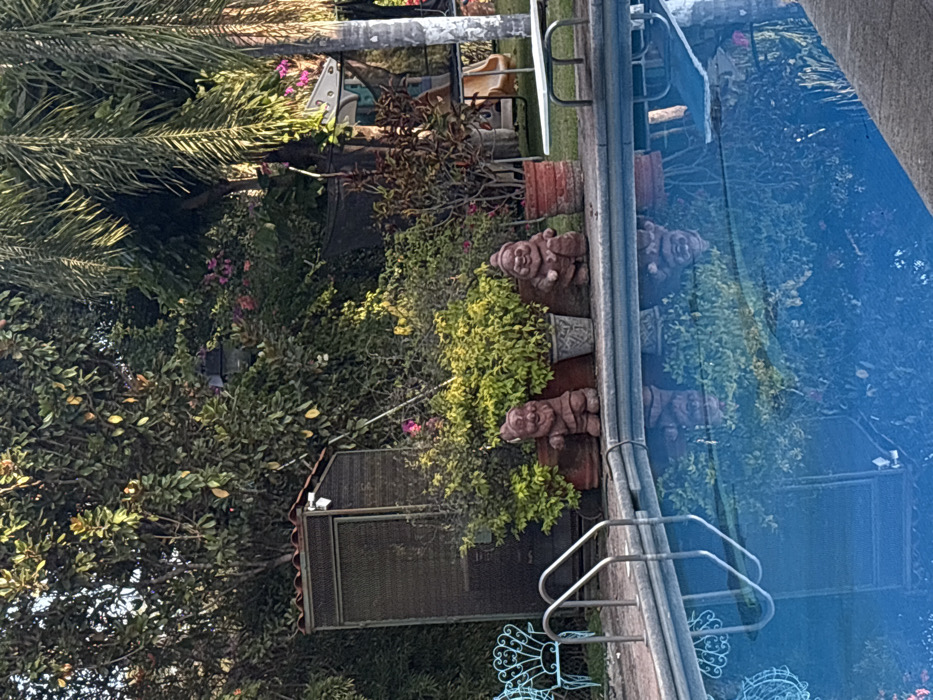 backyard scene with a pool and lush vegetation. Garden gnomes sit on a wall next to the pool, positioned in decorative pots. A small, shed-like structure is visible in the background, nestled among trees. The pool's metal ladder and surrounding tiles suggest a well-maintained area. The image is rotated, causing it to appear sideways.