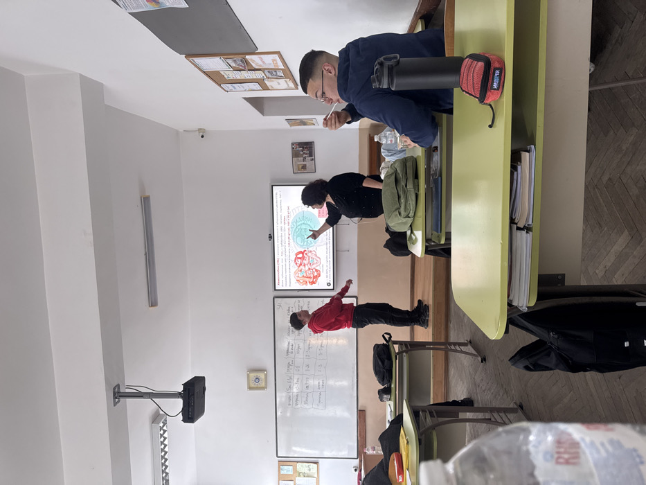 The image depicts an active classroom scene within a building in Zlatograd, Bulgaria. A female instructor, dressed in dark attire, stands on a raised platform at the front of the room, pointing with her right hand at a large interactive display screen. The screen displays anatomical diagrams, possibly of the brain, accompanied by Cyrillic text, likely in Bulgarian. To her left, a male student in a red hoodie and black pants stands on the same platform, his left arm slightly raised, looking towards the display or instructor. To the right of the instructor, a second male student, wearing a dark blue hoodie and glasses, is seated at a light green desk in the mid-ground. He is actively eating from a white container with a spoon, looking forward towards the presentation area. A black water bottle and a small red zippered case are on his desk. The classroom features light-colored walls and a herringbone-patterned wooden floor. A whiteboard covered with handwritten notes and equations is positioned to the left of the interactive screen. A ceiling-mounted projector is visible overhead. Other light green desks are arranged in rows, some with black backpacks resting on or near them. A partial view of a clear plastic water bottle is in the extreme foreground, out of focus. A bulletin board with various papers is affixed to the right wall, and a small security camera is mounted high on the wall. A wall clock with a distinctive blue evil eye design is mounted above the left whiteboard.