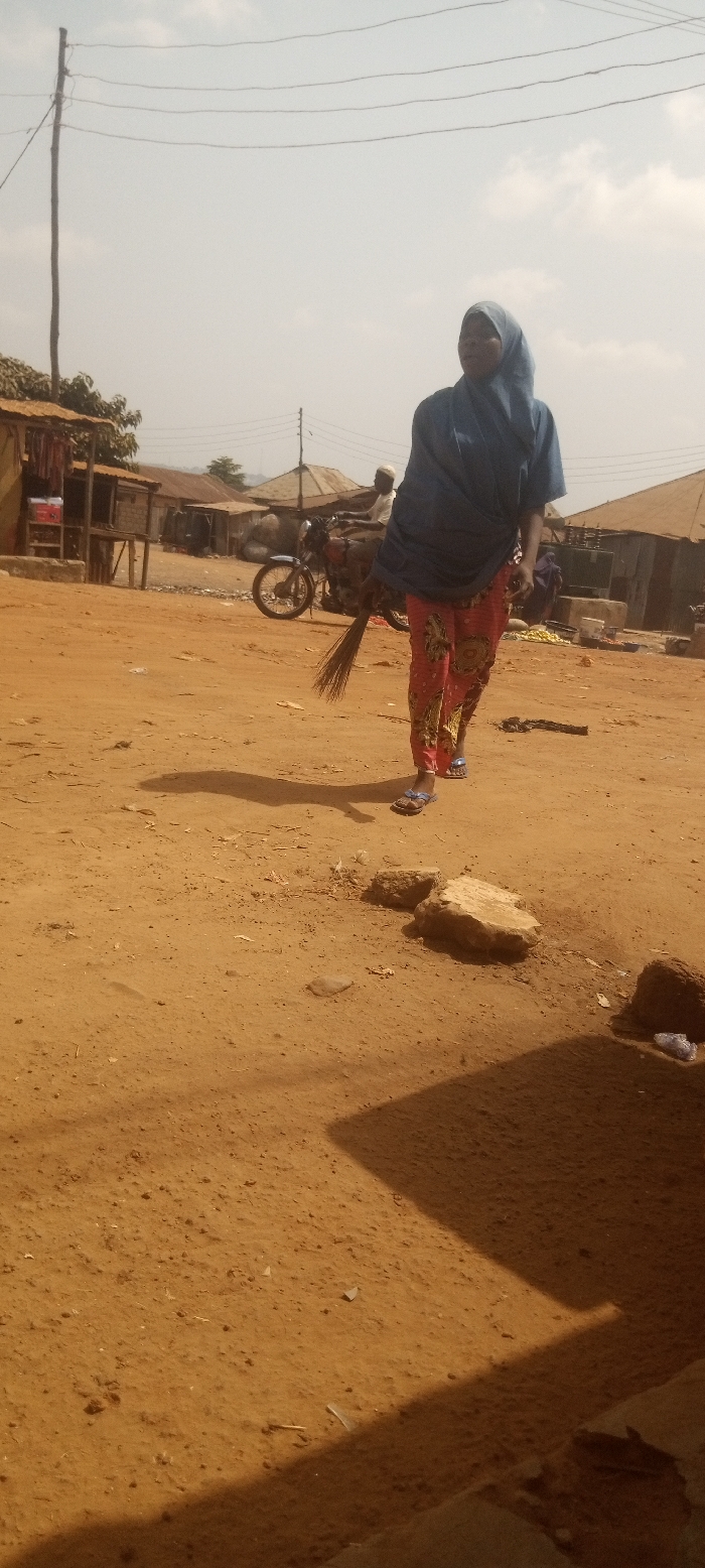 The image captures an unpaved, reddish-brown dirt road within a semi-urban environment in Minna, Nigeria, under a hazy blue sky. An adult female is positioned centrally, walking from the left to the right side of the frame, her head slightly turned to the left. She wears a light blue hijab, a matching loose-fitting top, patterned red trousers, and blue sandals. In her right hand, she carries a small, traditional broom composed of bundled sticks, pointed towards the ground. Her elongated shadow extends behind her on the dusty surface. In the mid-ground, a male individual wearing a white cap is seated on a dark-colored motorcycle, facing towards the right. The background features multiple rudimentary structures, consisting of corrugated metal roofs and walls, unpainted concrete blocks, and exposed wooden frames, consistent with market stalls or small dwellings. A tall, dark wooden utility pole with several overhead power lines is visible on the far left. Sparse green vegetation is present behind some of the structures. The foreground consists of rough, dusty ground with scattered small stones and debris, including a large, light-colored concrete block on the lower right, casting a shadow.
