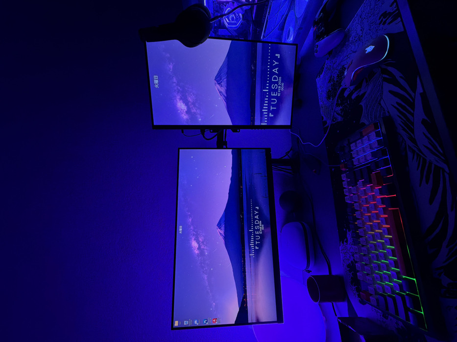 Two monitors, stacked vertically, display a purple mountain landscape with date and time. A gaming mouse and backlit keyboard sit on a black mousepad with a floral pattern. Headphones hang above the top monitor. The room is illuminated with a blue light.