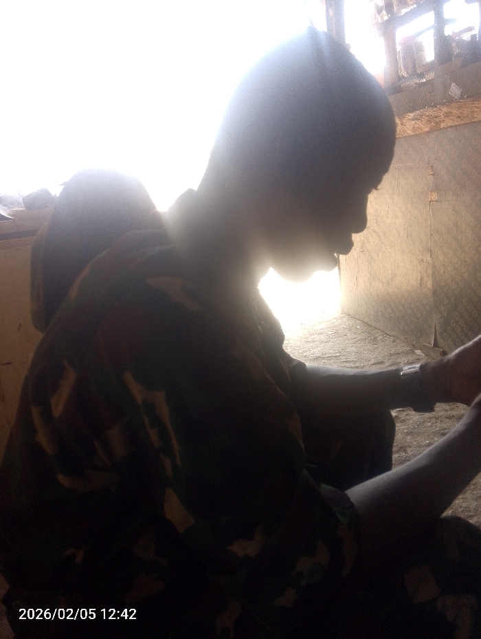 A single individual, age and gender indiscernible due to silhouetting, is depicted seated or crouched indoors in Unknown, Unknown, on 2026/02/05 at 12:42. The person's head is in profile, facing right. They are wearing a camouflage-patterned long-sleeved garment. A wristwatch is visible on their left wrist, and their right hand appears to hold a small, indistinct object. The background is characterized by intense white overexposure from a light source, likely an opening, positioned behind and to the left of the individual. Dark, textured surfaces, consistent with wooden panels, are visible in the right background, and the ground surface is uneven and indistinct.