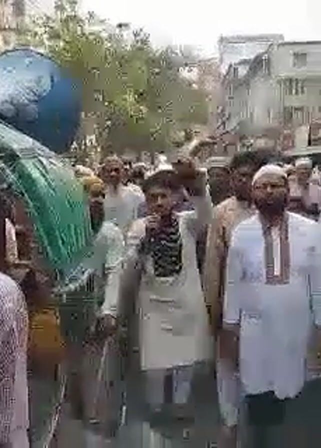 crowd of men walking down a street, some wearing traditional Muslim clothing. A man in a white kurta with a patterned scarf around his neck holds a microphone and appears to be speaking or chanting. Another man has his arm raised in the air. In the foreground is a large, decorated blue object, likely part of a religious procession. The street is lined with buildings, and there are trees visible in the background.