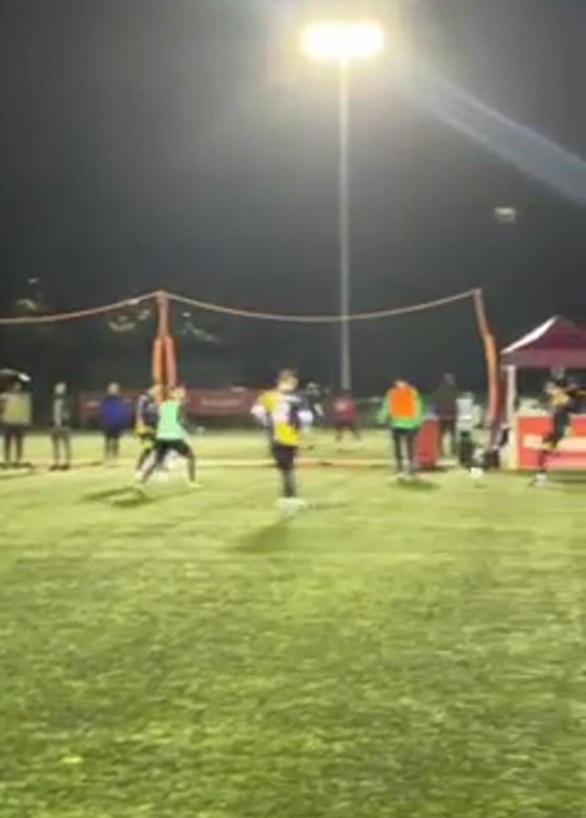 group of people playing soccer on an artificial turf field at night. There are at least 10 people visible, wearing a mix of light and dark clothing. Overhead lights illuminate the field. There are some soccer goals and orange training nets set up. The players are kicking the ball to each other and running around the field. Some spectators are standing near the edge of the field, watching the game. The background includes trees and some other structures or tents.