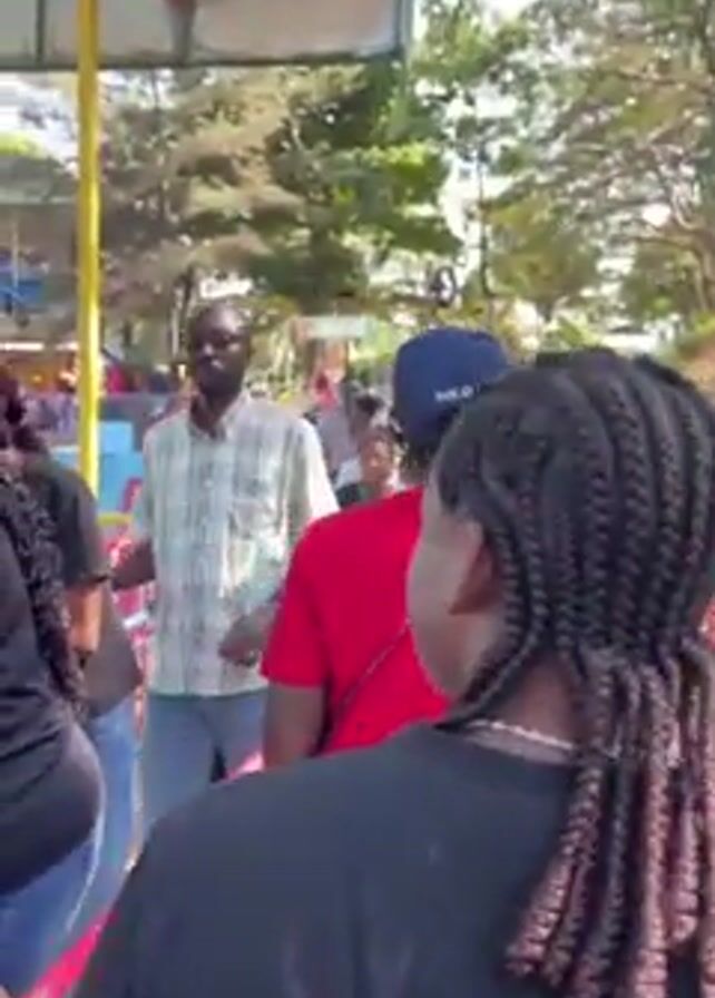 The camera is positioned behind a person with dark braided hair and a black shirt. This person is standing in line at an outdoor amusement park. Ahead in the line, a diverse group of people can be seen, including a man in a plaid shirt and sunglasses, someone in a red shirt and blue baseball cap, and others in various casual outfits. A bright pink railing runs along the edge of the queue line. Lush green trees and vegetation fill the background, suggesting a natural setting within the amusement park. The sun is shining, casting shadows and creating a bright, summery atmosphere. The amusement park rides are visible in the distance, hinting at the recreational activities available.