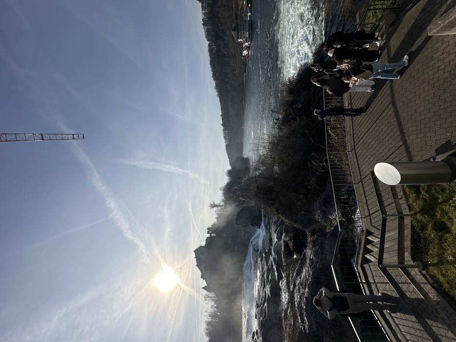 The image depicts the Rheinfall waterfall in Neuhausen am Rheinfall, Switzerland, under clear, sunny conditions. The bright sun is positioned in the upper left quadrant of the light blue sky, which is marked by multiple intersecting contrails forming an "X" pattern. The metal jib of a large construction crane is visible extending from the upper right corner of the frame. In the midground, the powerful Rheinfall cascades over rocky terrain on the left, generating a significant amount of mist that partially obscures Schloss Laufen, a prominent castle structure situated on the hill overlooking the falls on the left bank. Downstream, the Rhine River flows from left to right, exhibiting dark, choppy water. A multi-story building with white facades and dark roofs, likely a hotel or restaurant, is visible on the far bank of the river in the right midground, surrounded by dense, leafless trees. In the foreground, an observation platform, paved with grey interlocking pavers and enclosed by a dark metal railing, occupies the lower portion of the image. A set of wooden steps with metal railings leads down to this platform from the left. On the left side of the platform, one individual, viewed from behind, wears a light-colored jacket and a backpack, standing with hands raised towards their head, observing the waterfall. On the right side of the platform, a group of approximately 6-8 people is gathered near the railing, also looking out at the falls and river. They are dressed in casual winter attire. A cylindrical, silver-colored metal post stands on the platform to the right of the staircase. The surrounding ground near the platform shows patches of dry grass and dark, bare vegetation.