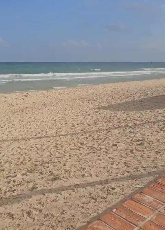 static, medium-distance shot of a sandy beach on a sunny day. The sand is light brown and shows footprints. In the background, the ocean is visible, with gentle waves rolling towards the shore. The water transitions from a light turquoise near the shore to a deeper blue further out. The sky is mostly clear with a few wispy clouds. A red brick walkway or border is partially visible in the foreground along the bottom of the frame. A white plastic bucket and a red can-like object are visible on the sand. Shadows are cast on the sand, likely from objects or structures just outside the frame.