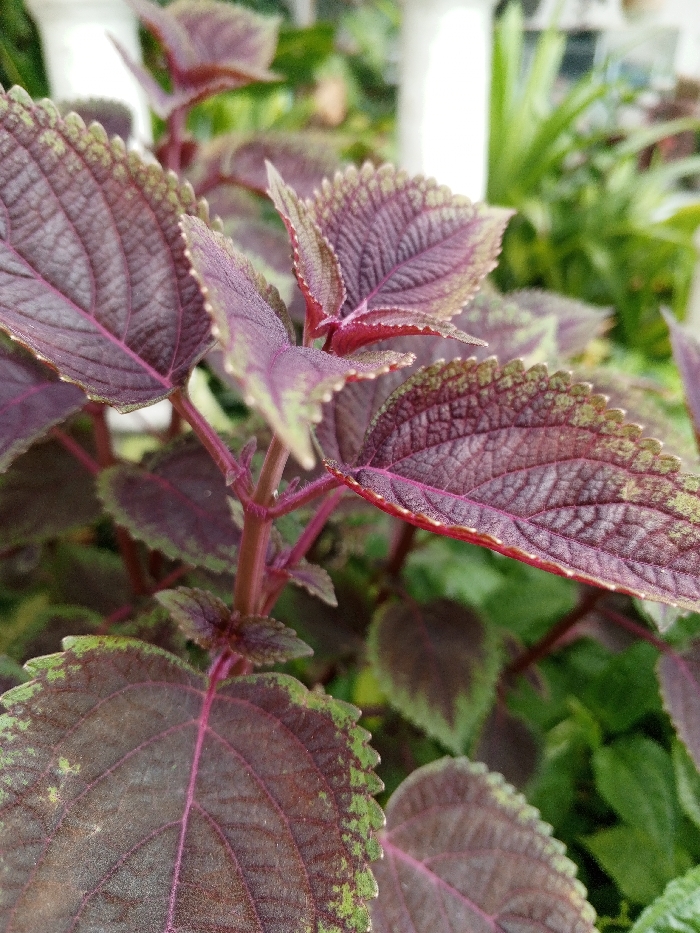 The image depicts a close-up, static scene of a plant, situated in an indeterminate outdoor environment within the City of Unknown, Unknown. The plant features multiple leaves, each broadly ovate with sharply serrated margins. The primary coloration of the leaves is a dark burgundy to purplish-red, with a distinct lighter green or yellowish-green rim along the serrated edges. Prominent, deeply impressed venation is visible across the leaf surfaces, matching the dark coloration. The stems and petioles are also dark reddish-purple and exhibit fine, hair-like textures. No individuals, animals, or human-initiated actions are present. The background is rendered out of focus, showing blurred green foliage and a singular, vertical, out-of-focus white object, suggestive of a structural element, in the upper right area.