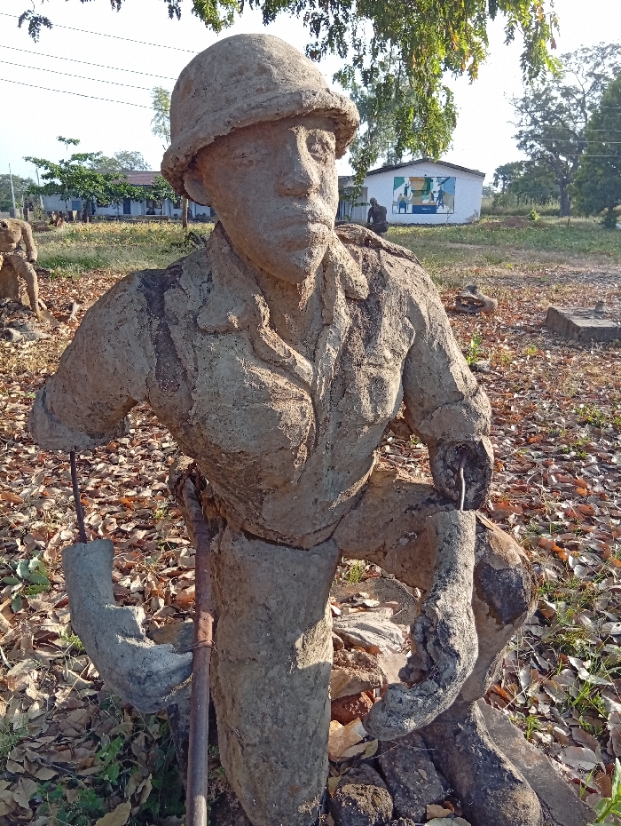 An outdoor scene in Akwanga, Nigeria, features a weathered concrete statue of a soldier in a kneeling position in the foreground