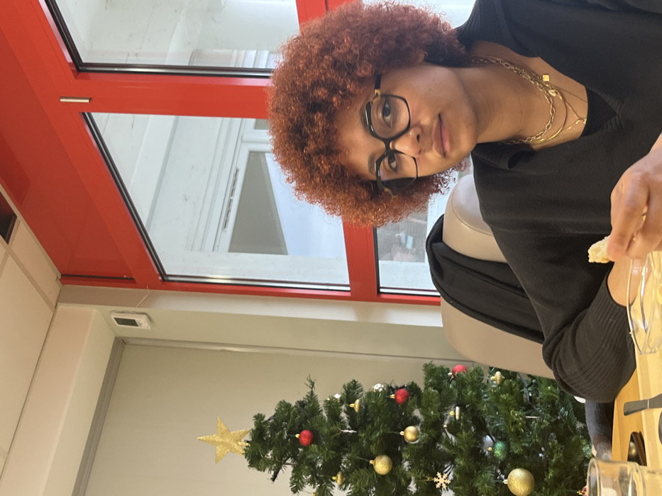 This image depicts an indoor scene in Oberhausbergen, France, featuring one individual and a festive display. A young female, positioned slightly off-center to the right, is seated at a light-colored table. She has reddish-brown, voluminous curly hair and wears black-framed glasses, a dark v-neck top, and layered gold-colored necklaces. Her right hand holds a piece of light-colored bread or cracker over a clear glass bowl containing a light-colored dip or liquid. She looks directly towards the camera with a neutral expression. To her left, an artificial Christmas tree stands, adorned with a gold star topper, red and gold spherical ornaments, and white snowflake decorations. A light gray wall serves as the background behind the tree and to the left. A small, white, rectangular wall-mounted device is visible on this wall in the upper left quadrant. Behind the female, a light brown padded chair is partially visible. The right side of the frame is dominated by a large window with bright red frames, through which an external building structure with white window frames and an overcast sky are visible.