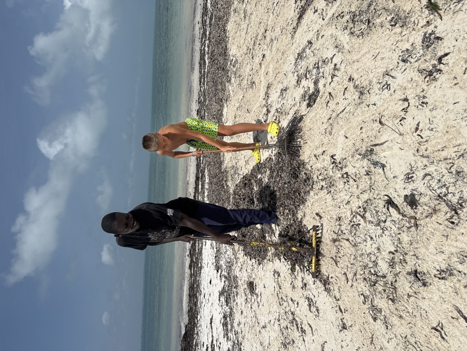Two individuals are engaged in a beach cleanup activity in Zanzibar, Tanzania, under a clear sky with scattered white clouds. The sandy beach is heavily covered with dark brown and black seaweed and debris, particularly in the foreground and midground. The ocean, appearing calm and light turquoise, is visible in the background. On the left, an adult male, likely of African descent, wears a dark t-shirt and dark trousers. He is smiling and looking downwards and to his right, actively using a yellow-handled rake with a broad, dark metal head to gather seaweed into a pile. On the right, a pre-teen male, likely of Caucasian descent, wears bright green patterned swim trunks and bright yellow Crocs. He is focused on his task, using a dark-handled rake with a fan-shaped silver metal head to rake seaweed. Both individuals are actively raking and accumulating piles of seaweed on the white sand, working side-by-side.