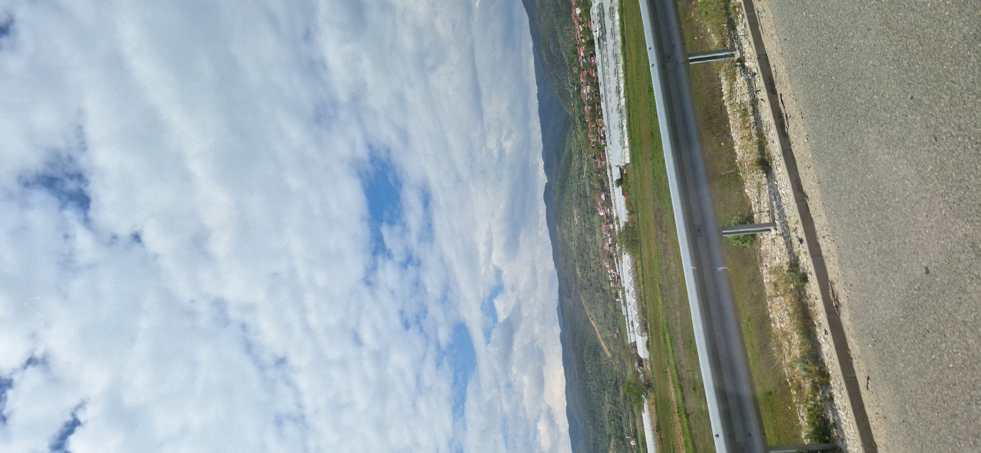 view of Mikrevo, Bulgaria, from a roadside. The sky is filled with white, streaky clouds with patches of blue. A mountain range covered in green vegetation runs along the horizon. Near the base of the mountains, the town of Mikrevo is visible, with closely packed houses and structures. In the foreground, a guardrail runs parallel to a paved road. Beyond the guardrail, there is a strip of green grass. The perspective suggests the photograph was taken from a moving vehicle on the road.
