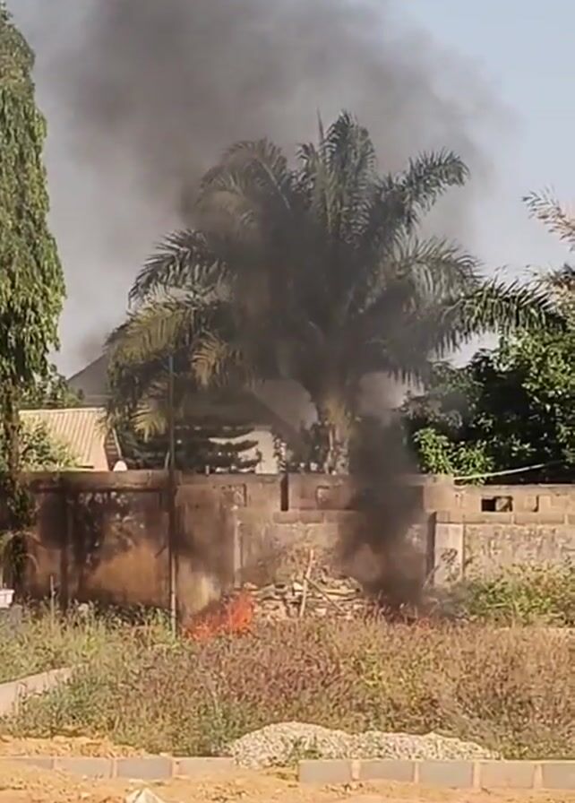 A fire burns behind a cinder block wall, sending thick black smoke billowing into the air. A palm tree and other greenery stand behind the wall, partially obscured by the smoke. A residential building can be seen in the background. The ground in front of the wall is dirt and low vegetation.