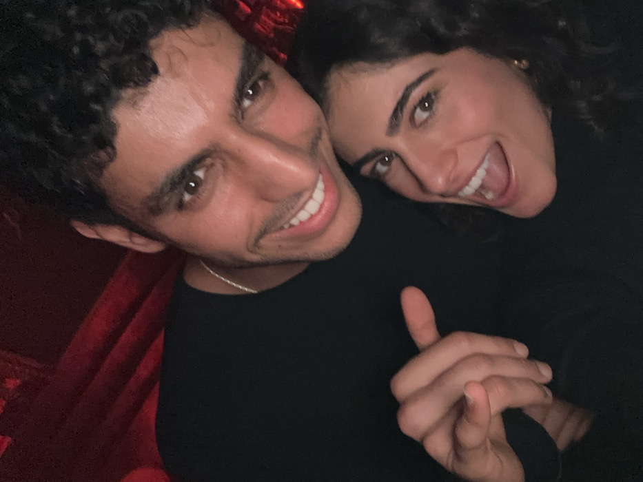 A man and woman pose closely together, both smiling broadly at the camera. The man has dark curly hair, dark eyes, and a slight mustache. He wears a black top and a silver necklace. The woman, with dark hair, leans her head towards the man. They are both wearing black tops, and the woman has light skin. The man holds one hand, giving a thumbs-up, against the woman's hand in a dark ambiance. The background hints at red fabric.