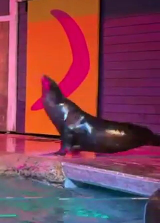 sea lion on a stage in what appears to be a show. The sea lion is dark brown and wet, standing on a slightly elevated platform next to a pool of water. A woman wearing a purple shirt, black shorts, and black boots walks up to the sea lion. The background features a blue-purple wall with a large orange and pink design. The lighting on the stage is a mix of pink and blue. There is music playing in the background.