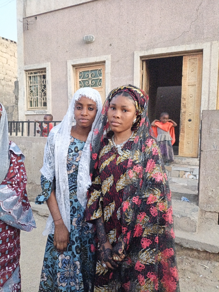 Three young women stand outside a building. The woman on the left wears a patterned blue dress and a white lace head covering. The woman in the center wears a patterned black dress with a dark, lacy head covering. Her hands are decorated with henna. The woman on the far left wears a patterned dress with a head covering. In the background, a child stands in a doorway. Another child stands by a black metal railing. The building has an exterior light fixture and two doors.