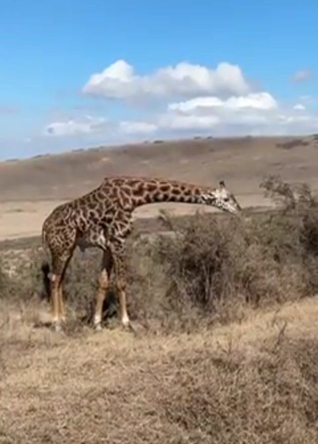 A giraffe, standing on a grassy, hilly terrain, is eating leaves from a bush. The giraffe has a dark brown and tan patterned coat. The sky is blue with scattered white clouds.