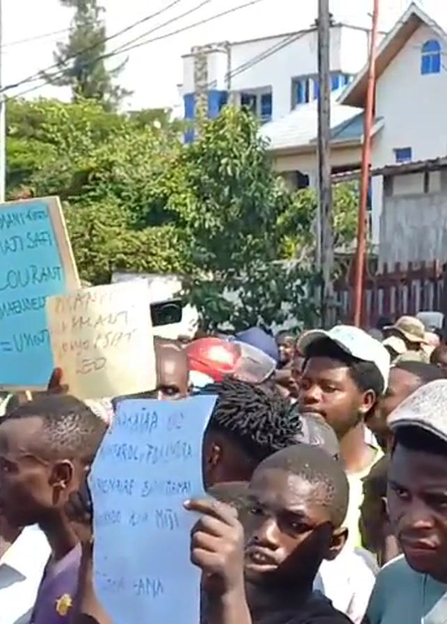 A large crowd of people, mostly young men, is participating in a protest march. They are holding up signs with writing in an African language. The signs appear to be making demands related to water, electricity, and other amenities. They are standing in front of a building and some houses are visible in the background. The sky is sunny. The crowd appears to be peaceful.