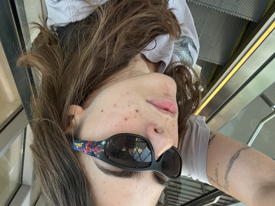 A person is depicted in a selfie-style shot, angled upward and rotated counter-clockwise, capturing their upper body on an escalator in an indoor public space in Unknown, Israel. The individual has long, wavy brown hair and wears black sunglasses with a Spider-Man graphic on the left temple arm. Their face shows several red blemishes on the forehead and cheek. The person is wearing a light-colored short-sleeved t-shirt with a dark graphic design on the right shoulder area. A dark, abstract, band-like tattoo is visible on their left upper forearm. In the background, an escalator with silver metal handrails, dark steps, and yellow safety lines is clearly visible, ascending from the lower portion of the frame. Reflections of the environment are present in the sunglasses lenses and on metallic surfaces in the background.