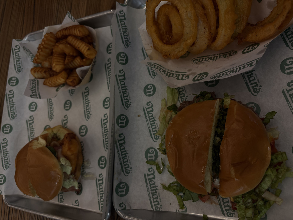 Two gray trays display Nathan's takeout food. On the left, crinkle-cut fries in a paper container and a partially visible burger. On the right, a larger burger cut in half with visible lettuce and tomato, and a paper container filled with curly fries. Nathan's branded paper lines both trays.