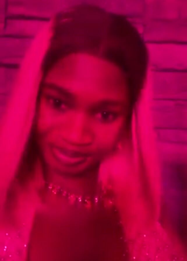 A person with medium-brown skin, light-blonde hair, and dark eyebrows and eyelashes is talking to the camera. They are wearing a sparkly top and a necklace with pink, green, and yellow stones. The background is a wall with a grey brick pattern. The lighting changes from pink to green. The person is smiling and appears to be in a good mood.