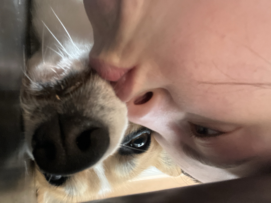 The image displays a close-up, angled perspective of a human face interacting with a dog. The upper left section of the frame shows the right side of a human's face, characterized by fair skin. A visible right eye, with a dark iris, gazes toward the lower right. The human's lips are pursed, making direct contact with the dog's muzzle in what appears to be a kiss. Fine strands of hair are visible on the human's cheek. The lower right portion of the image features the head of a dog, primarily tan and white in coloration, positioned horizontally. The dog's left eye, dark and reflective, is partially visible. The prominent black nose of the dog is centered, surrounded by a white muzzle from which white whiskers extend. The interaction captures the human's mouth pressed against the dog's muzzle. The immediate foreground consists of a dark, flat surface, while the upper background shows indistinct lighter tones, suggesting an indoor setting. This event takes place in Gangloff, Germany.