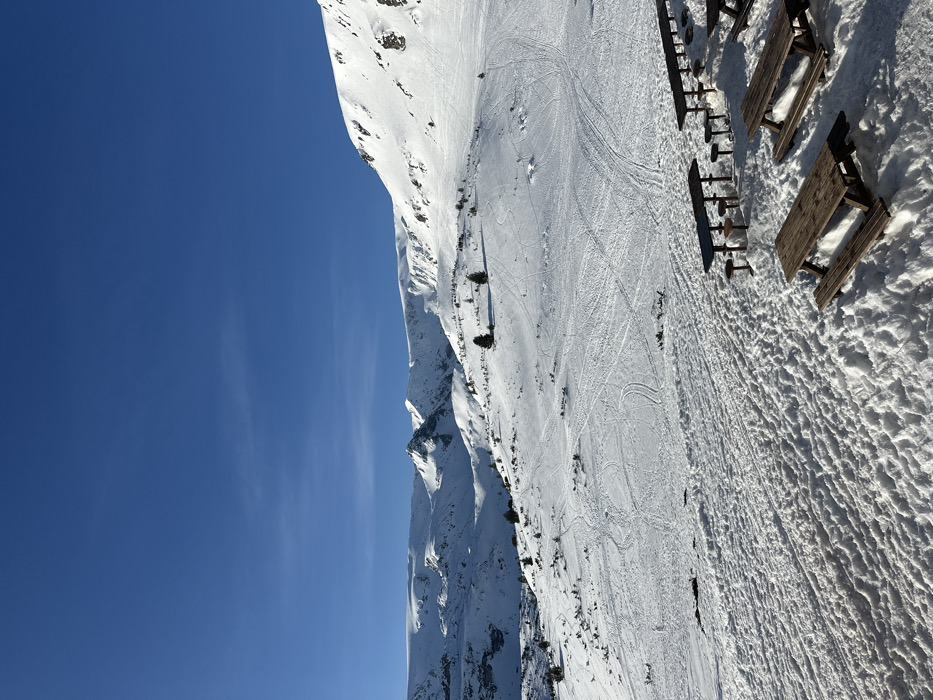 The scene depicts a snow-covered mountain landscape in Panichishte, Bulgaria, under a clear, bright blue sky. Expansive snow-covered slopes dominate the midground and background, featuring multiple peaks and ridges. The snow exhibits numerous tracks, consistent with skiing or snowboarding activity, particularly on the gentler inclines in the midground. Scattered evergreen trees, appearing as dark green clusters, are visible across the snowy terrain. In the immediate foreground, positioned on a snow-covered incline, are several outdoor seating arrangements. These include at least two light-colored wooden picnic tables with integrated benches, partially covered in snow. Further up the foreground slope, several darker-colored tables, possibly metal or stained wood, with individual round stools, are present. Direct sunlight illuminates the scene, casting subtle shadows. No human subjects are visible.