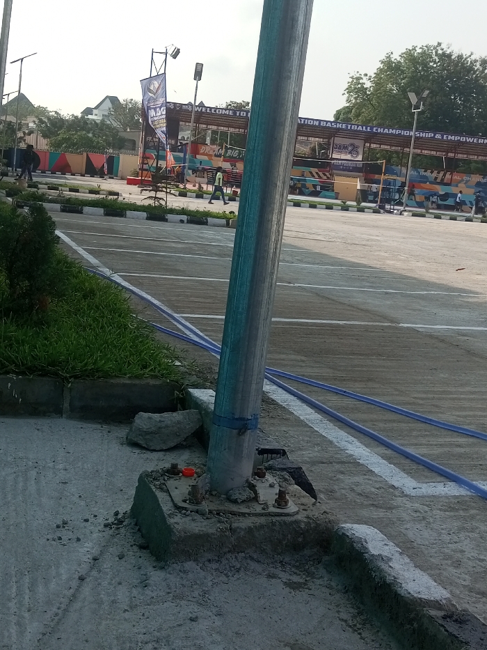 A metal pole stands on a concrete base with visible bolts and construction debris. Two blue hoses are loosely coiled near the base. A grassy area with small plants is to the left. In the background, a structure with signage related to a basketball championship is visible, with figures walking around. The area appears to be a parking lot or outdoor venue, with painted white lines marking parking spaces.