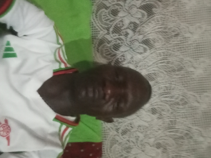 An older African man lies on a bed. He is wearing a white soccer jersey with green and red accents. His head is tilted to the right. A green blanket is visible behind him, and a patterned white lace blanket is underneath him. The scene is brightly lit and somewhat blurry.