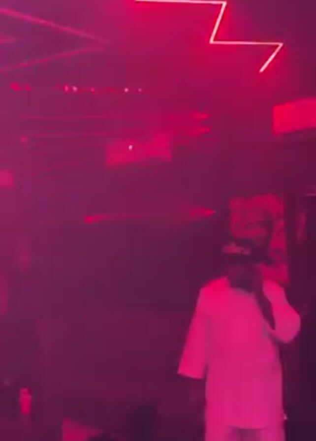 A man in a white outfit stands in a dark, smoky room illuminated by pink lighting and red lasers. He holds a microphone and appears to be performing or speaking. There is a poster of a man on the wall behind him, and the room has a club-like atmosphere with additional light fixtures and air conditioning units visible on the ceiling.