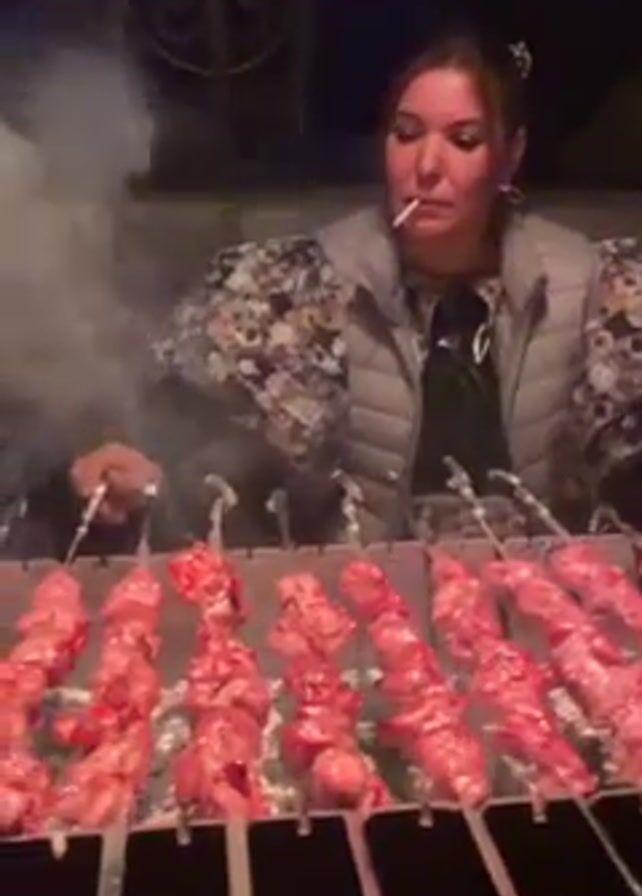 A woman with a cigarette in her mouth tends to raw meat skewers smoking on a barbecue grill