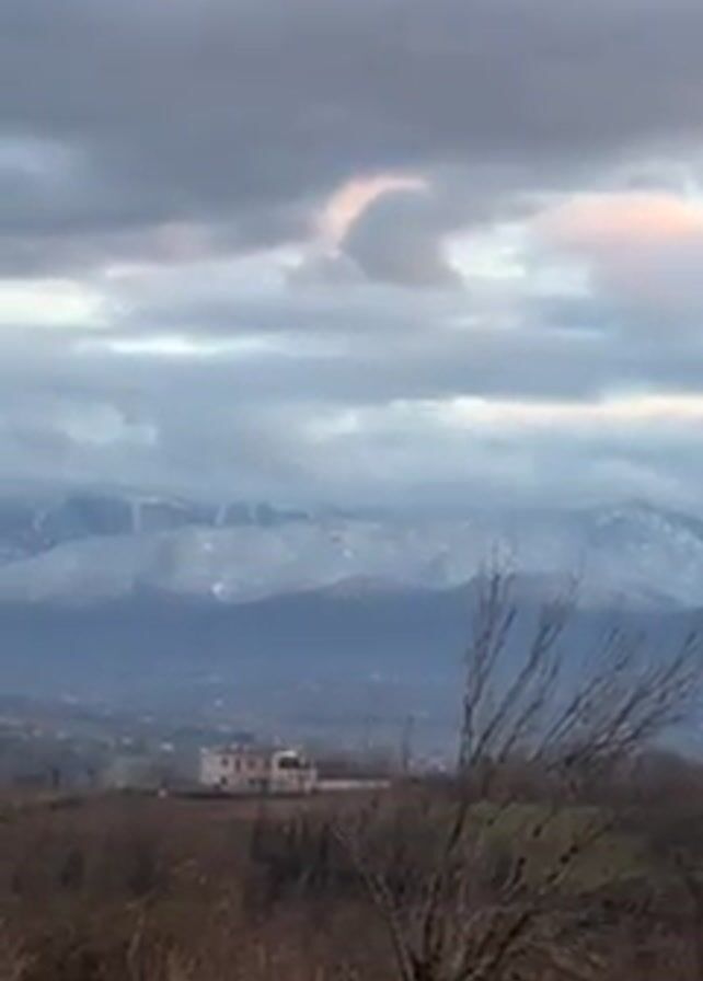 landscape with mountains in the background partially covered in snow. The sky is overcast with a variety of gray clouds. A building can be seen in the midground, on a small hill. In the foreground is a barren tree branch. The camera appears to be still.
