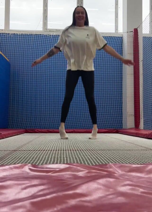 A woman is jumping on a trampoline in a gym or recreational space. She is wearing a white t-shirt, black leggings, and white socks. The trampoline has a blue net backdrop and is surrounded by padded surfaces, pink in the foreground and yellow on the sides. Large windows are visible in the background, indicating it is daytime. The woman performs several jumping actions, including a straddle jump and a split leap.