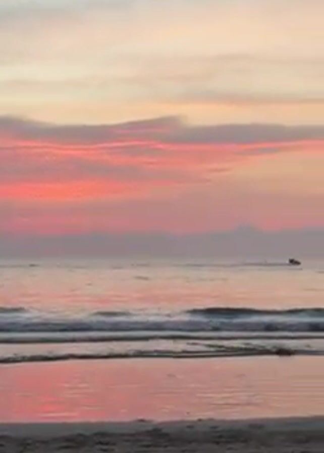 beach scene at sunset or sunrise. The sky is filled with pink and orange hues, reflected in the calm water. Gentle waves are rolling onto the sandy beach. In the distance, there are a few people in the water, appearing as dark silhouettes. A jet ski briefly appears further out in the water. A blue object, possibly a beach chair, is partially visible in the foreground.