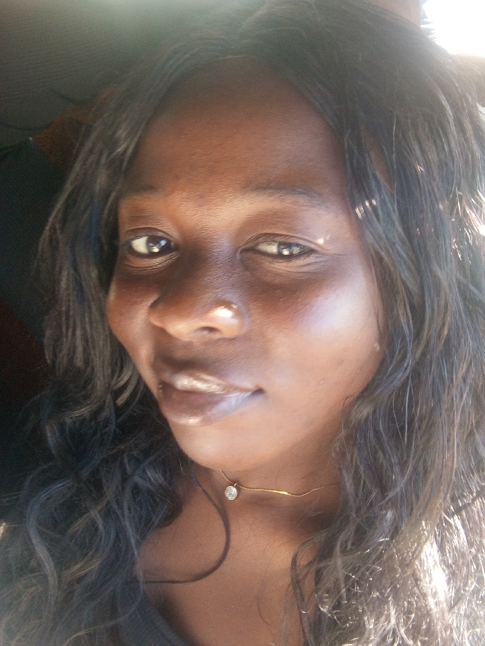 A close-up, chest-up portrait depicts an adult female with dark skin and long, wavy, dark hair