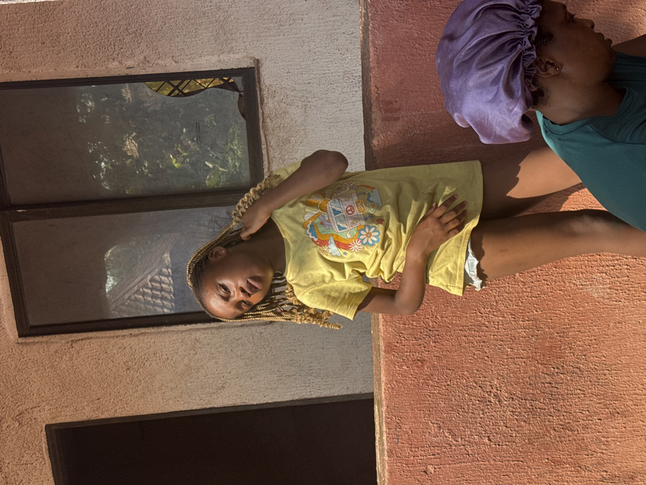 This image captures an outdoor scene in Aguata, Nigeria, featuring two females under direct sunlight. In the central foreground, a young female with dark skin and long, light blonde box braids stands, leaning against a textured orange-brown wall. She is wearing a yellow t-shirt with a colorful graphic depicting a "peace" bus, flowers, and the word "LOVE." Light-colored shorts are partially visible beneath her shirt. Her left hand is positioned near her neck, while her right hand rests on her stomach. Her head is slightly tilted, and she looks directly towards the camera with a neutral expression. Behind the standing individual, a building facade is visible, constructed with light beige textured stucco. Two dark-framed rectangular windows are set into this wall. The windowpanes reflect green foliage and a red-tiled roof. The right-hand window exhibits a partially broken or missing pane on its right side. In the lower right portion of the frame, a second female is partially visible, appearing to be seated or crouched lower than the standing subject. This individual also has dark skin and is wearing a dark green top. Her head is covered by a shiny, ruffled purple satin bonnet, and her gaze is directed downwards and to the right, mostly out of frame. The strong shadows present indicate bright, direct sunlight conditions.