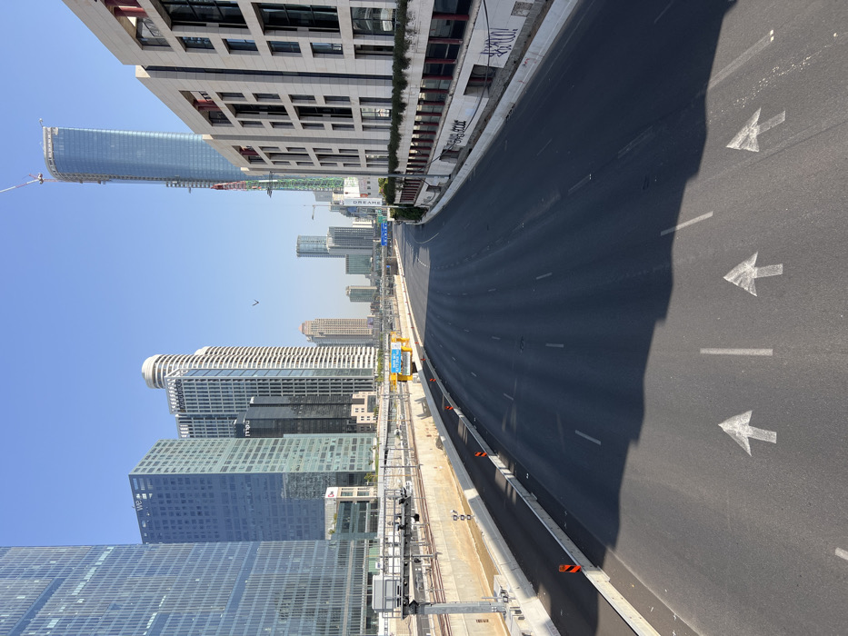 An elevated view captures the Ayalon Highway looking south in Tel Aviv, Israel, near the Azrieli Sarona complex, under a clear blue sky during daylight hours. The foreground displays an empty asphalt multi-lane road marked with white forward-pointing arrows on the two visible lanes, indicating straight-ahead traffic. Distinct shadows from an unseen overhead structure fall across the road surface. To the left of the roadway, a concrete barrier separates it from an active construction zone, featuring exposed light rail tracks, overhead gantries, and associated infrastructure. Further left, a cluster of modern glass-clad skyscrapers dominates the skyline, including a building with "We" visible on its facade. To the right, a multi-story building with a light-toned facade and prominent window bays features graffiti at its lower levels. Beyond this building, the cityscape continues with numerous high-rise structures. In the mid-ground and background, a towering glass-clad skyscraper, currently under construction and topped with a crane, stands prominently. Other high-rises, including a distinctive curved white building, contribute to the dense urban environment. No vehicles or individuals are present on the visible roadway or surrounding areas.