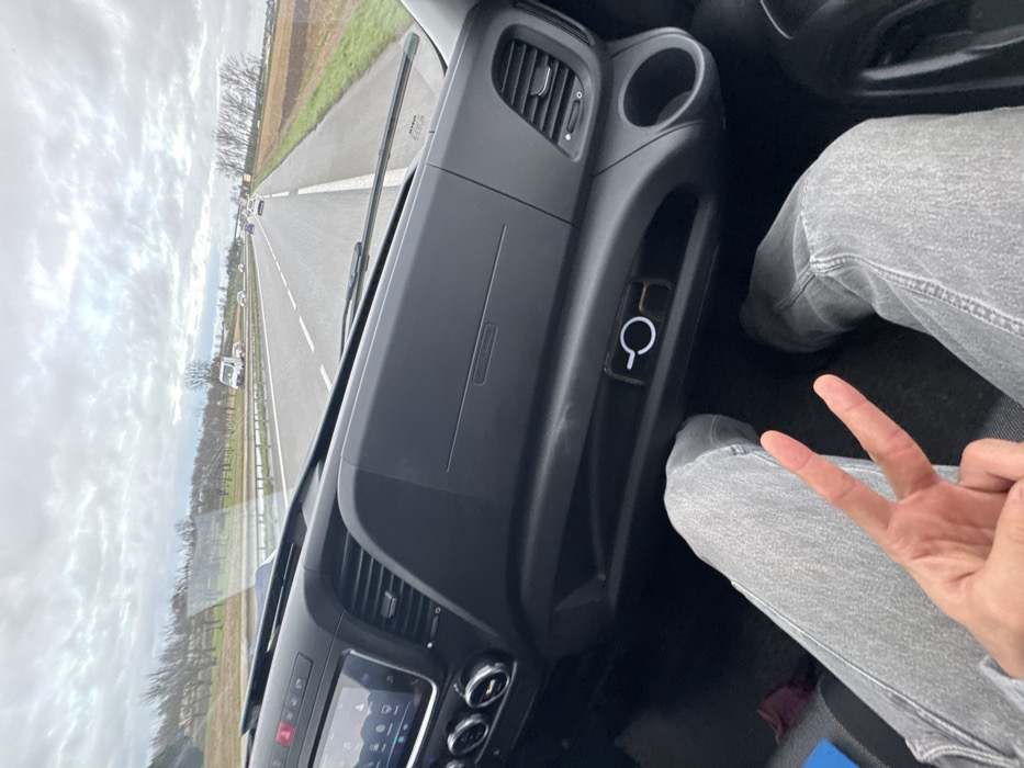 The image provides a front passenger's interior view of a vehicle in motion on a multi-lane highway near Nordhouse, France, under an overcast sky. The passenger's legs, clad in grey denim jeans, are visible in the foreground, with their left hand raised, forming a peace sign (V-sign) using the extended index and middle fingers. The black dashboard features an infotainment system on the driver's side (left), multiple air vents, and a central recessed storage compartment. Within this compartment, a black rectangular device with a white circular design and a smaller 'P'-shaped marking is visible. A recessed cup holder is located on the far right of the dashboard. Outside the windshield, a paved highway with white lane markings extends into the distance. A metal guardrail separates the highway from the roadside, which includes bare deciduous trees, brown and green fields, and a reflective surface or body of water on the left. Multiple vehicles, including a white box truck, are present on the highway. The sky is uniformly overcast with light grey cloud cover.