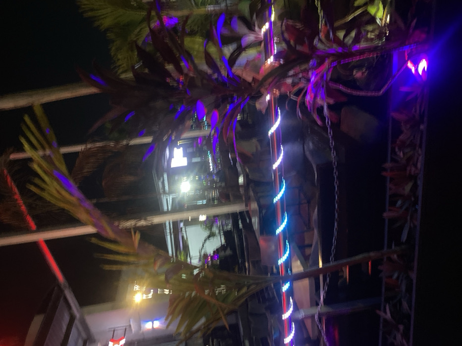 - "A night scene shows palm trees adorned with colored lights" by FM-6XMFv1, licensed under CC BY 4.0